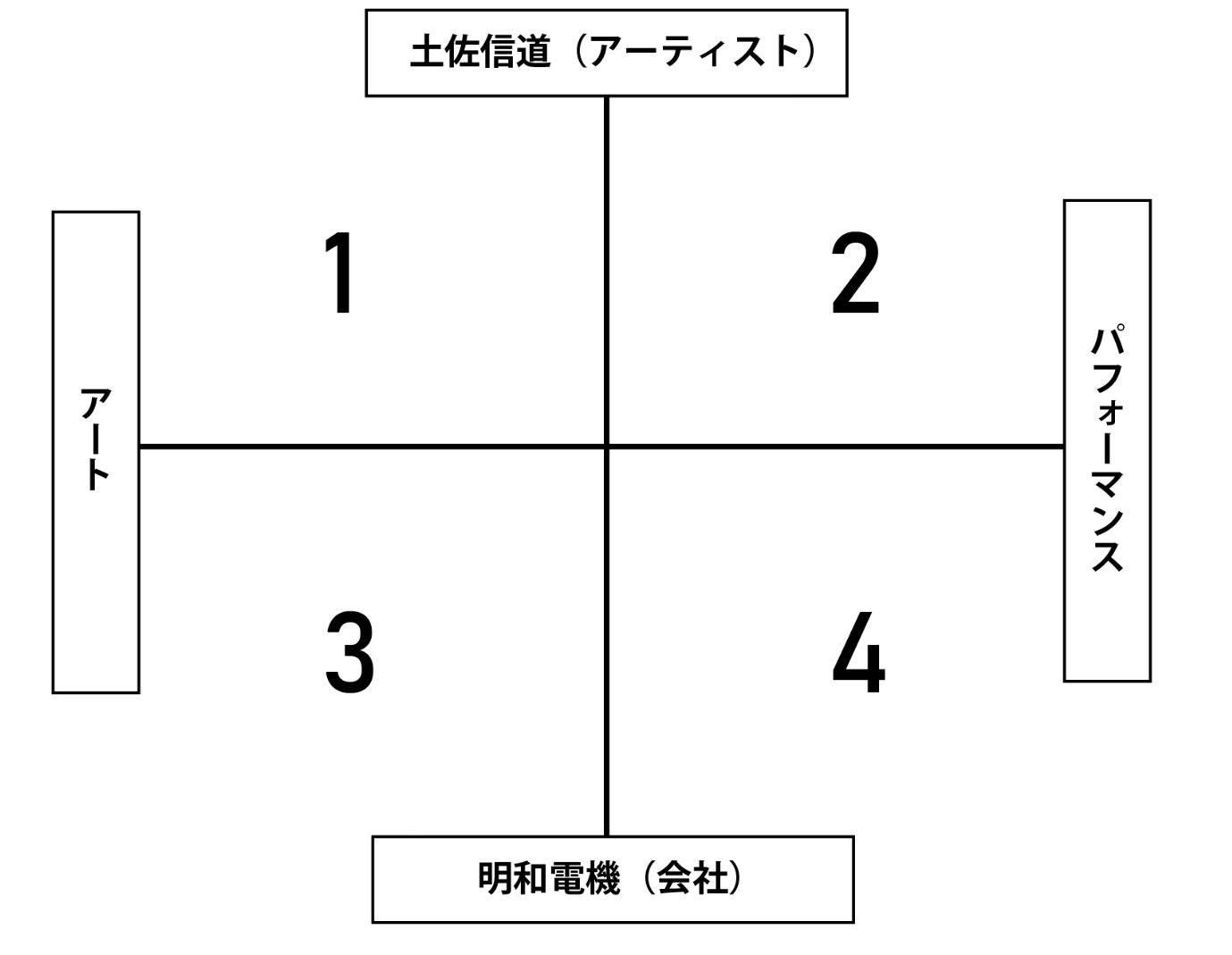 活動が多岐にわたるため、そのマネージメント作業の全体感を把握するのは大変難しいのですが、たて軸に「土佐信道(個人)」と「明和電機(会社組織)」、そしてよこ軸に「アート」と「パフォーマンス」をおき、それにより分割された4つのフェーズごとに見ていくと、活動全体の動きがわかりやすくなります。